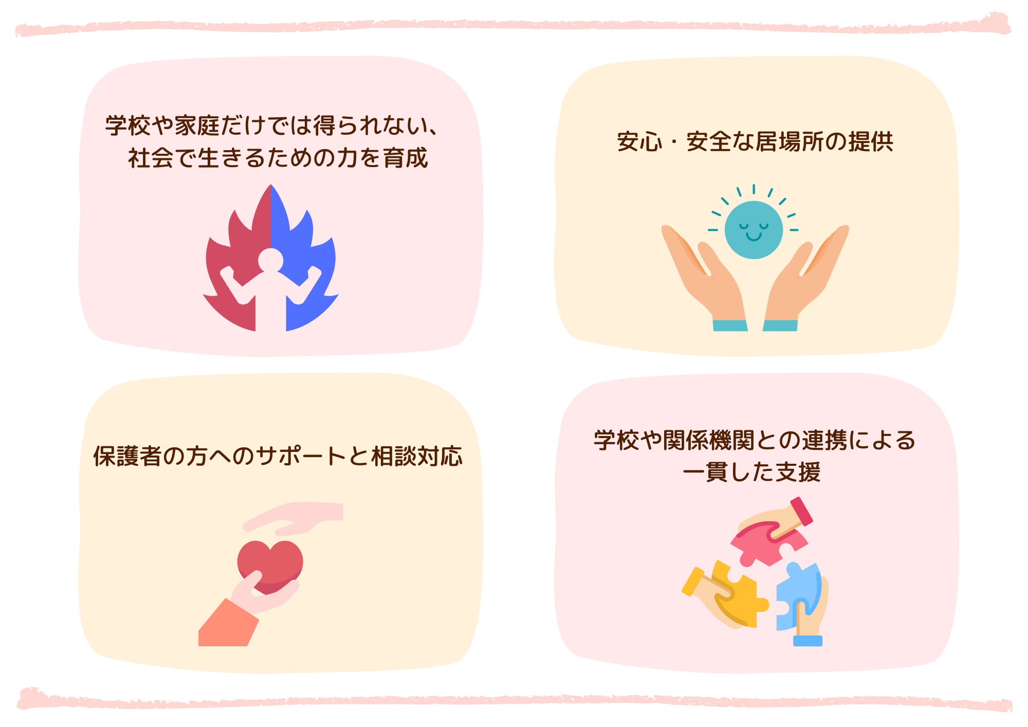 遊びや学びを通して、生活スキルや社会性、自己肯定感を育むことを目的としています。
